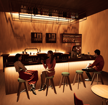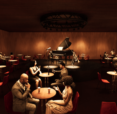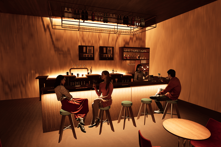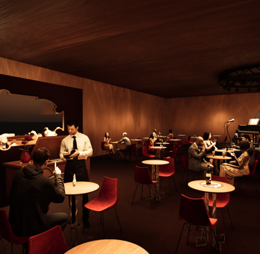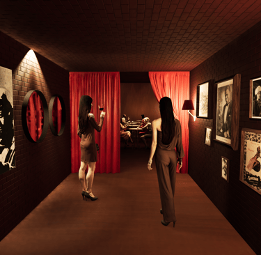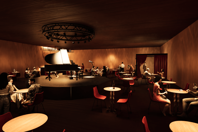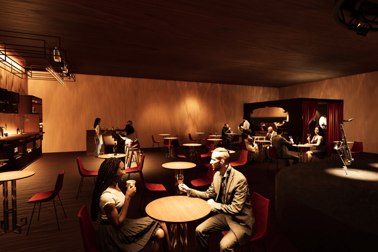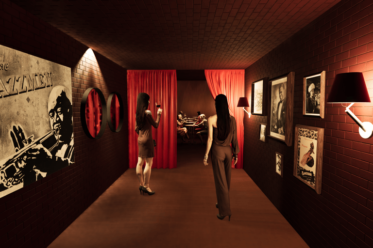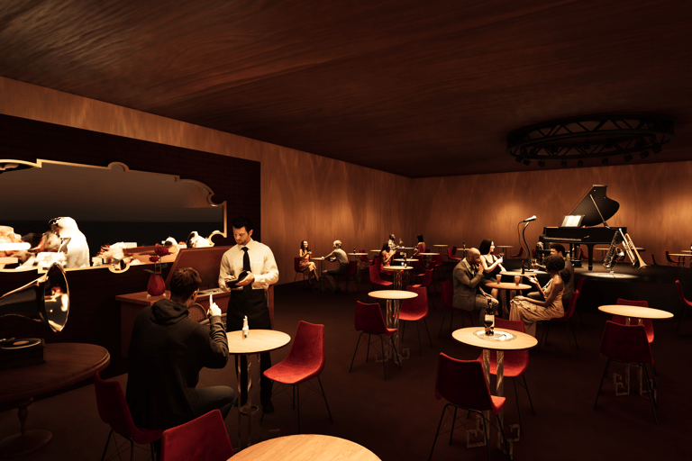 Along with the centered stage is the bar area, and on the opposite side, the entrance hallway introduces the intimacy of the space. Together they create a suspenseful yet inviting atmosphere, carried throughout by dark wooden finishes, dim lighting, and vintage furnishings—all chosen with detail to capture the essence of jazz: warmth, elegance, and timeless comfort.