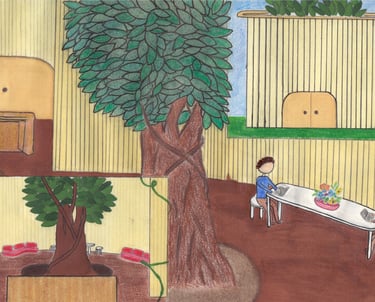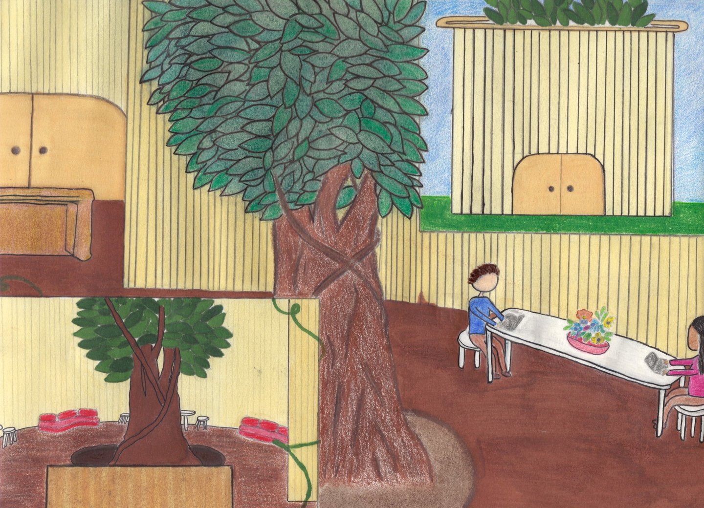 I decided to create an office setting to demonstrate how biophilic design can make a workplace feel more relaxing and organic. Through the presence of lush vegetation, employees can focus on work or unwind during their lunch break while remaining present in nature, as opposed to the monotony of four white walls in most office spaces. Natural elements, therefore, have a significant psychological factor that greatly impacts work ethic.
