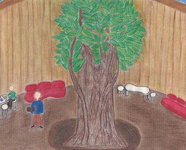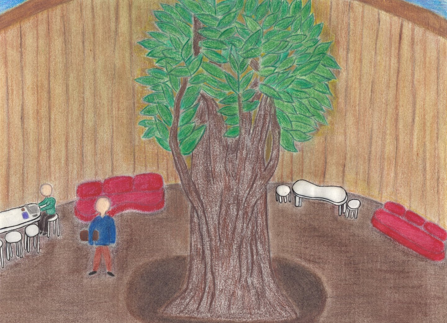 The intention behind centering the tree within circular parameters and making it the focal point was to symbolize the importance of integrating green spaces into interior spaces in unique forms. Just a single plant species is enough to transform an environment by providing pure oxygen and contributing to temperature regulation, proving the benefits greenery has on human health and energy efficiency.