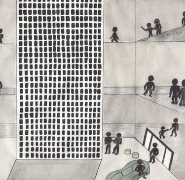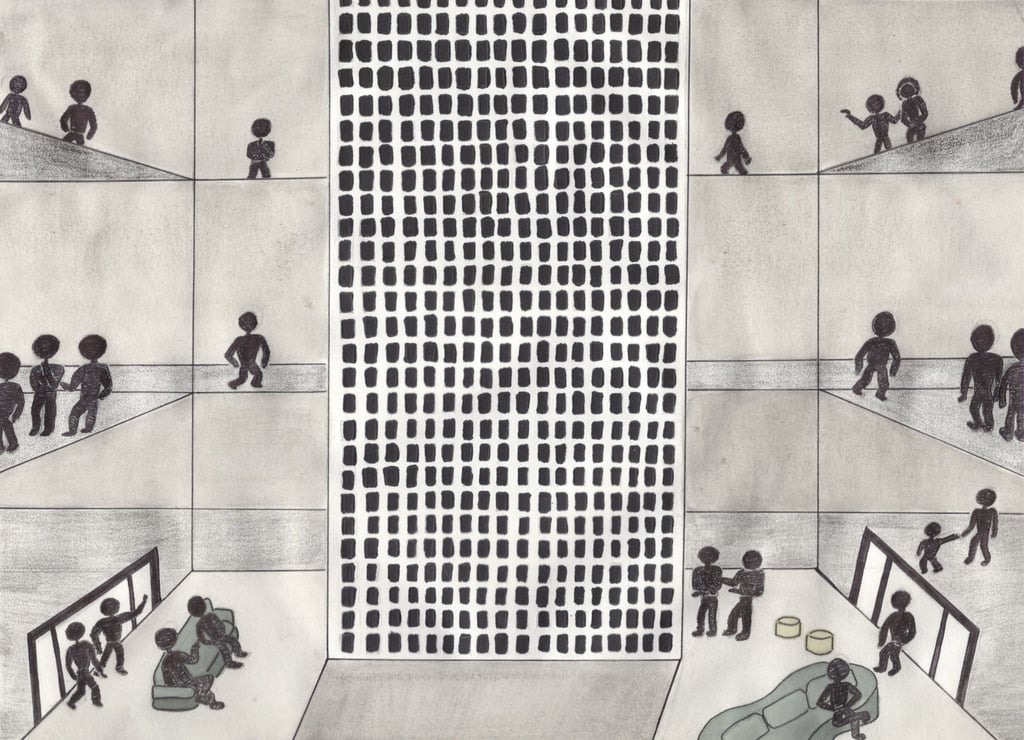 Originally envisioned as the centerpiece of a contemporary museum, the digital glass panel takes form as a three-dimensional structure reaching ceiling height within the glass-covered, three-story building. Upon entering the space, visitors are required to input their phones into a narrow, transparent passageway. These devices are then transferred into the panel, stacked vertically alongside hundreds of others.